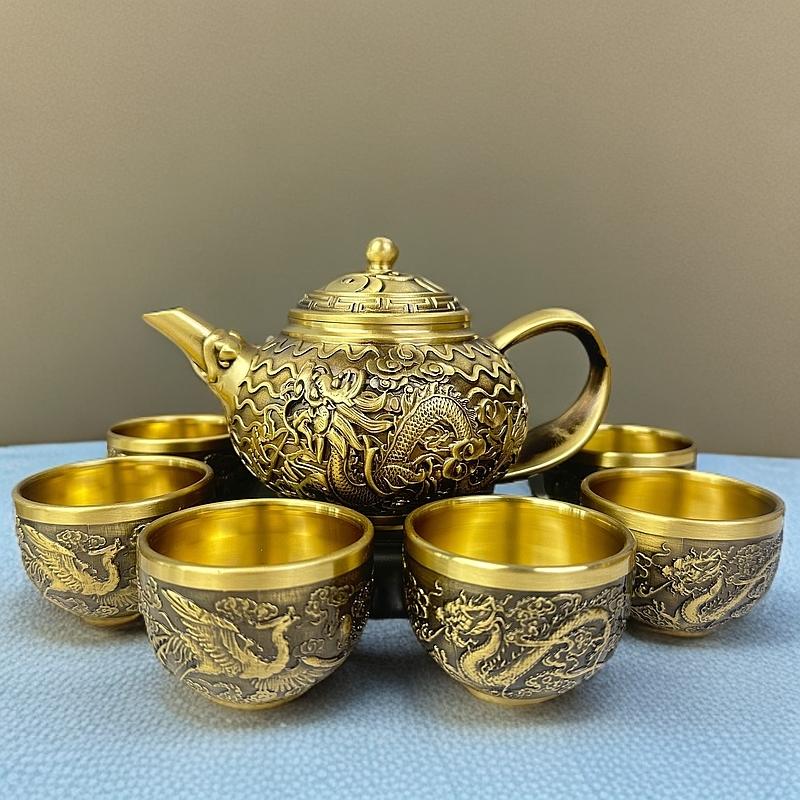 半小時前新款套裝【一壺八杯】中式浮雕黃銅龍鳳壺復古大容量龍嘴壺擺件 - 純黃銅茶具 龍鳳10件組【1茶壺8杯1底座】-NT$2698