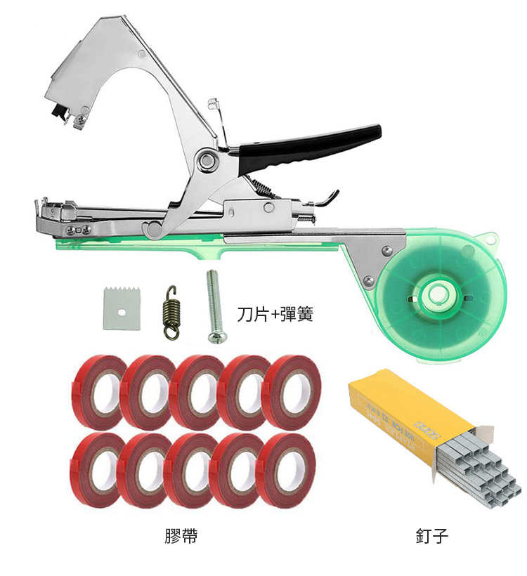 2分鐘前綁枝好幫手,綑綁省時省力 ?超高效率,只需2秒即完成綁枝 ?適用於番茄、黃瓜、葡萄、豆子、茄子等莖蔓類植物綑綁 - 【黑金剛綁枝機】+刀片+彈簧+20卷加厚膠帶+1盒釘(1萬枚 )
